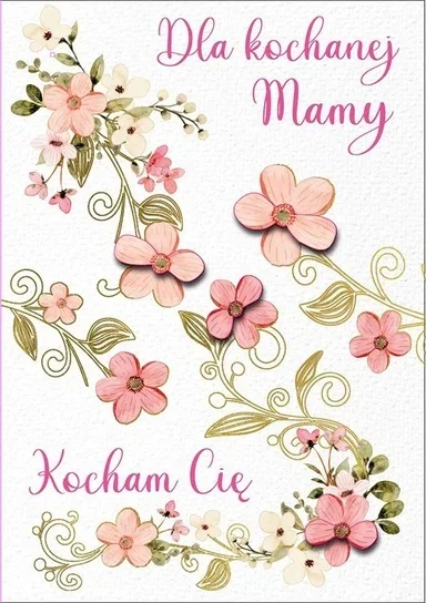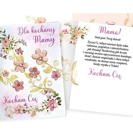 Piękny karnet z okazji Dnia Matki zdobiony przestrzennymi kwiatkami, ozdobionymi kryształkami. kartka w tonacji pastelowej, z napisem Kocham Cię. W środku znajdują się piękne życzenia dla mamy, które możesz wykorzystać albo wpisać własne prosto z serca.