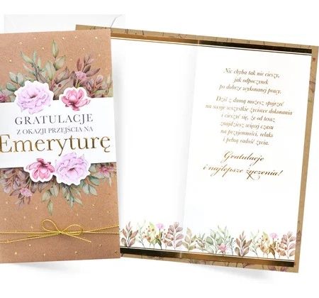 Ta kartka to gratulacje z okazji przejścia na Emeryturę dla niezwykłej osoby, która rozpoczyna nowy rozdział życia! Kartka z życzeniami w środku o treści: “Nic chyba tak nie cieszy, jak odpoczynek po dobrze wykonanej pracy. Dziś z dumą możesz spojrzeć na swoje wszystkie życiowe dokonania i cieszyć się, że od teraz znajdziesz więcej czasu na przyjemności, relaks i pełna radość życia. Gratulacje i najlepsze życzenia!”
