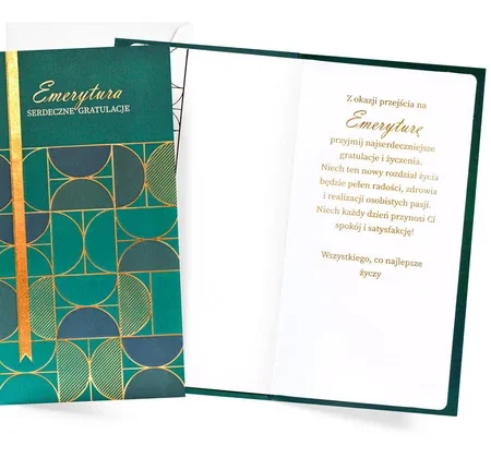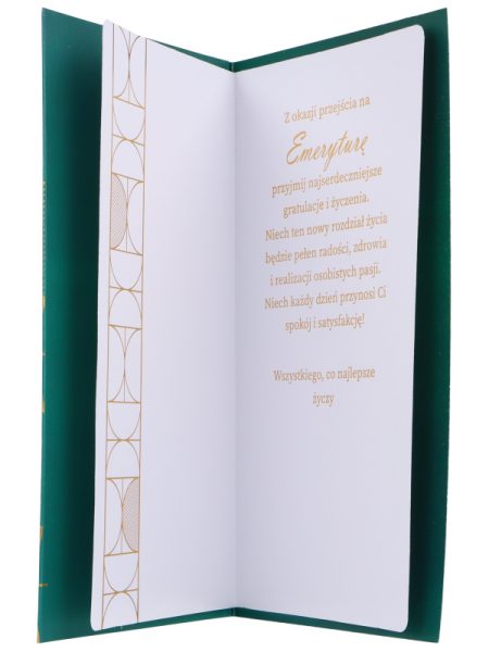 Kartka na emeryturę geometryczna złocenia Serdeczne gratulacje. Opis produktu: Format: Dl (21,5×11,5cm). Front: grafika, złocenia. Środek: pusty. Okazja: Boże Narodzenie. Koperta: ozdobna.