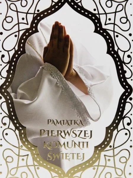 Piękna kartka komunijna przedstawiająca splecione w modlitwie dłonie. Liczne złocenia w formie ornamentu uzupełniają subtelność kartki. Karnet jest przeznaczona dla dziecka przystępującego do sakramentu świętego.