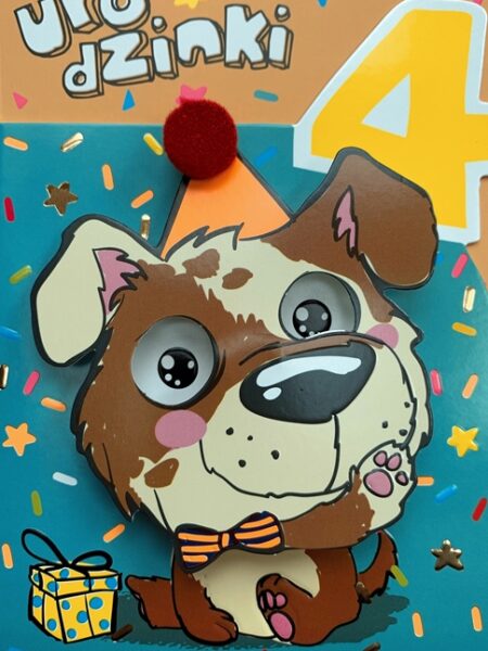 … bez butów i innych atrybutów. Spełniając rodziców marzenia i sny – TO WŁAŚNIE TY! 🙂 Karteczka z ozdobnej serii kolorowych zwierzaków jest niezwykle barwna, zaprojektowana tak by cieszyć najmłodszych. Do karteczki przyklejona jest zabawna, kiwająca się główka zabawnego pieska z czapeczką zakończoną mięciutkim pomponikiem. Karnet choć nieduży robi ogromne wrażenie, na pewno rozbawi każde dziecko!