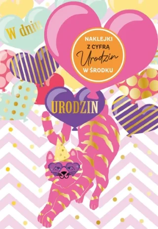 Kartka urodzinowa z kotem oraz z naklejkami cyfr w zestawie dla każdego